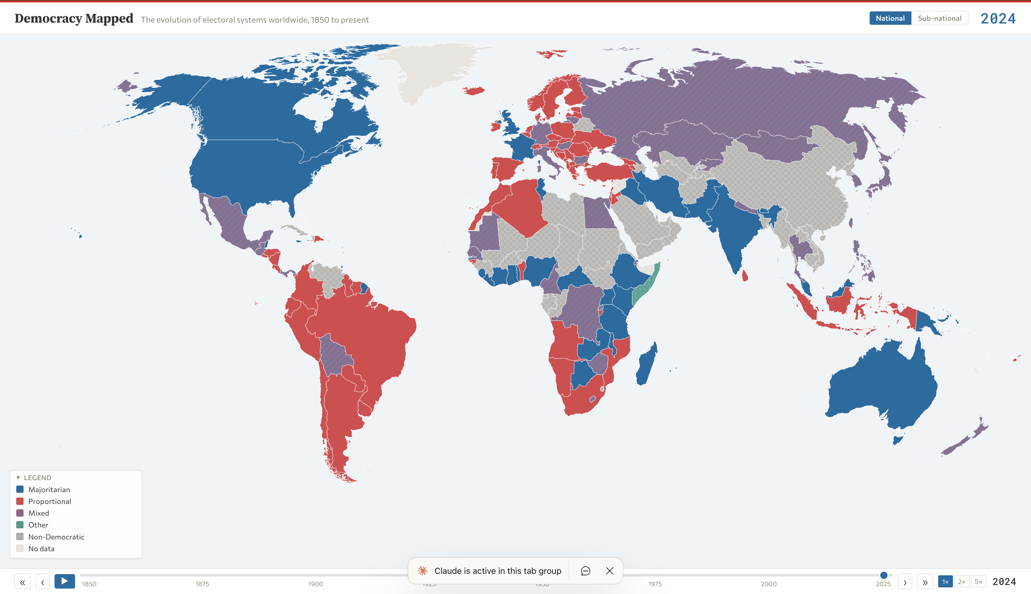 1. Interactive visualization of the evolution of electoral and democratic systems worldwide from 1850 to present. 176 countries with detailed period-by-period data.