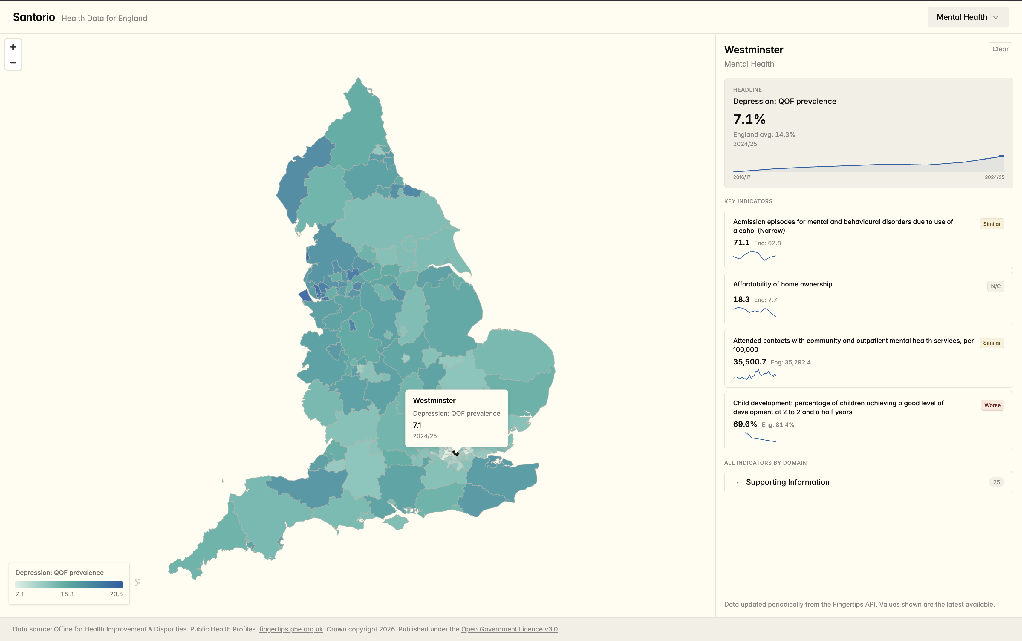 3. Public health data explorer for England. Choropleth map of local authority indicators with domain-level breakdowns.